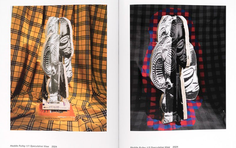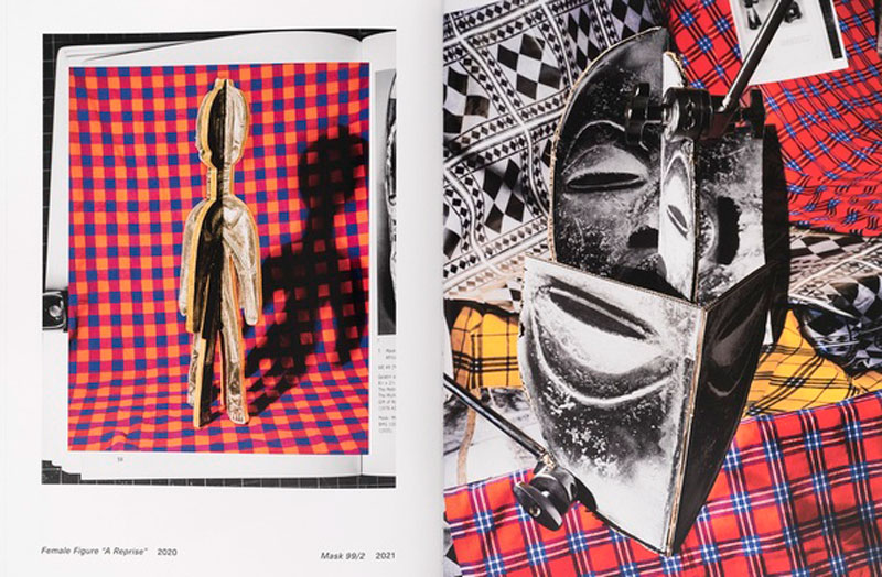 “A Reprise, David Alekhuogie’s first monograph, confronts the intriguing legacy of narrative and authorship behind Western presentations of African art, and poses timely questions about how Black aesthetics are circulated, accessed, valued, and interpreted today. In 1935, Walker Evans was commissioned by the Museum of Modern Art, New York, to photograph hundreds of African sculptures for the exhibition African Negro Art. Nearly ninety years later, Alekhuogie began investigating Evans’s images, provocatively remixing them into his own vibrant and multilayered photographic collages. Transposing facsimiles of Evans’s original images onto cardboard or paper structures of his own making, Alekhuogie rephotographs these image-sculptures against striking backdrops — often using East and West African textiles — thereby inviting multiple dimensions of viewership. Alekhuogie’s images draw upon the musical idiom of the reprise — a performance of repetition — and stake a claim to crucial, restorative ideas around Black antiquity by questioning our relationship to what we consider fake or original, art or archive.”