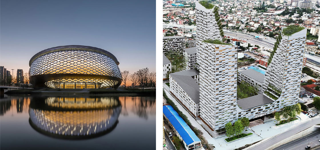 Photos: (Top) Winka Dubbeldam; Hybrid Stadium & Concert Hall Facade. (Bottom) Hybrid Stadium & Concert Hall Facade Sunset View © Archi-Tectonics; Festival City Masterplan Aerial View © Archi-Tectonics.