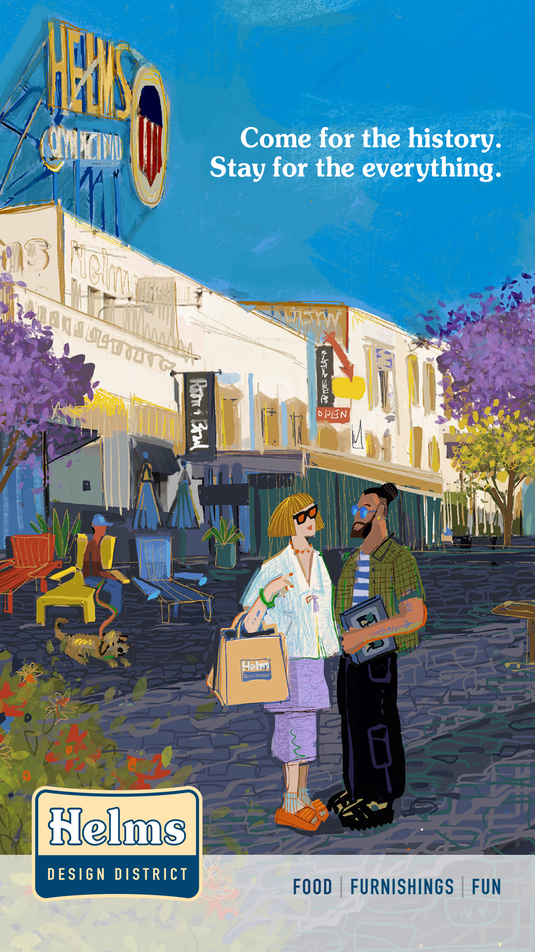 Sidewalk Stories is just beginning. Over the coming weeks, we’ll unveil more illustrations that showcase the heart of our district, each one inspired by real people and real places that make Helms so special. From cozy restaurants to design-driven showrooms, expect stories and snapshots of daily life in our creative community.